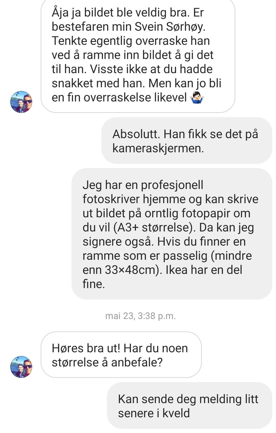 Så ble dette en ganske snill og koselig historie der jeg printet ut bildet, rammet det inn og Erlend kunne komme og hente det for å gi det i bursdagsgave til sin bestefar.